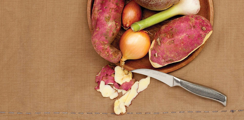 Wil je jouw etenswaren schillen of tourneren? Het Diamant Sabatier schilmes uit de Riyouri collectie is perfect om fijne snij- en schilwerkzaamheden mee uit te voeren. Door de kromme vorm van het lemmet van dit schilmes is het ook uitermate geschikt voor het tourneren van uw groenten en andere ronde etenswaren. De groenten die vaak getourneerd worden zijn wortels, komkommers en courgettes. Het Diamant Sabatier schilmes Riyouri 8 cm ontvangt je in een zwarte geschenkdoos en kunt u dus ook cadeau doen. Wij raden aan het mes na gebruik met de hand te reinigen.