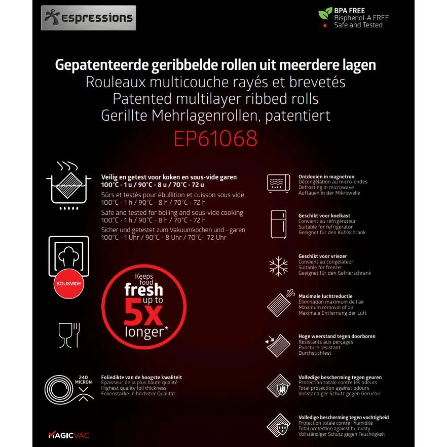 Garandeer dat er geen lucht of vocht meer bij je voedsel kan komen door te vacumeren met deze vacuumfolie van Espressions. Door te vacumeren kan je voedsel tot wel vijf keer langer bewaren en de smaken blijven behouden. Met de dikte van 240 micron zijn deze zakken van hoge kwaliteit en ze zijn BPA vrij. De formaten van dit folie is 15 bij 600 centimeter en het zijn 2 rollen. Ook geschikt voor sous vide koken!