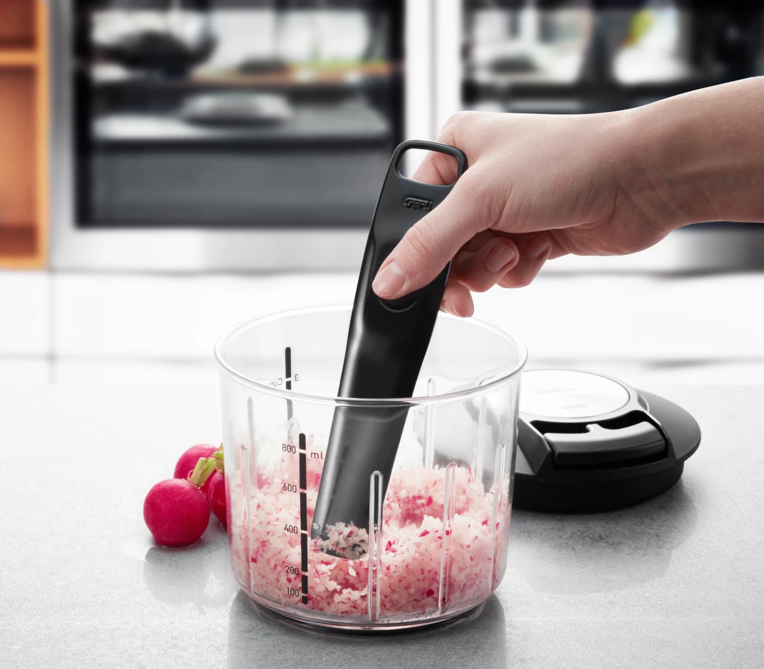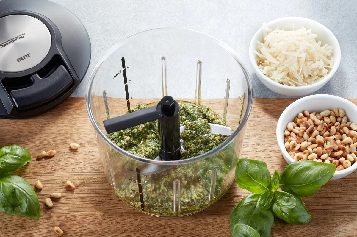 Met de Gefu Hakmolen kunt u eenvoudig groentes mixen, snijden of pureren. Dit doet u door middel van een handig touwmechanisme. De twee zeer scherpe geboge messen zorgen voor een optimaal resultaat. De snijder is gemaakt van kunststof. De twee snij- elementen zijn gemaakt van Japans lemmetstaal en hebben twee gevormde snijvlakken. De capaciteit van de transparante reservoir is 1000 ml. Door de trekmechanisme heeft u geen stroom nodig en kunt u de Gefu multisnijder overal mee naar toe nemen.