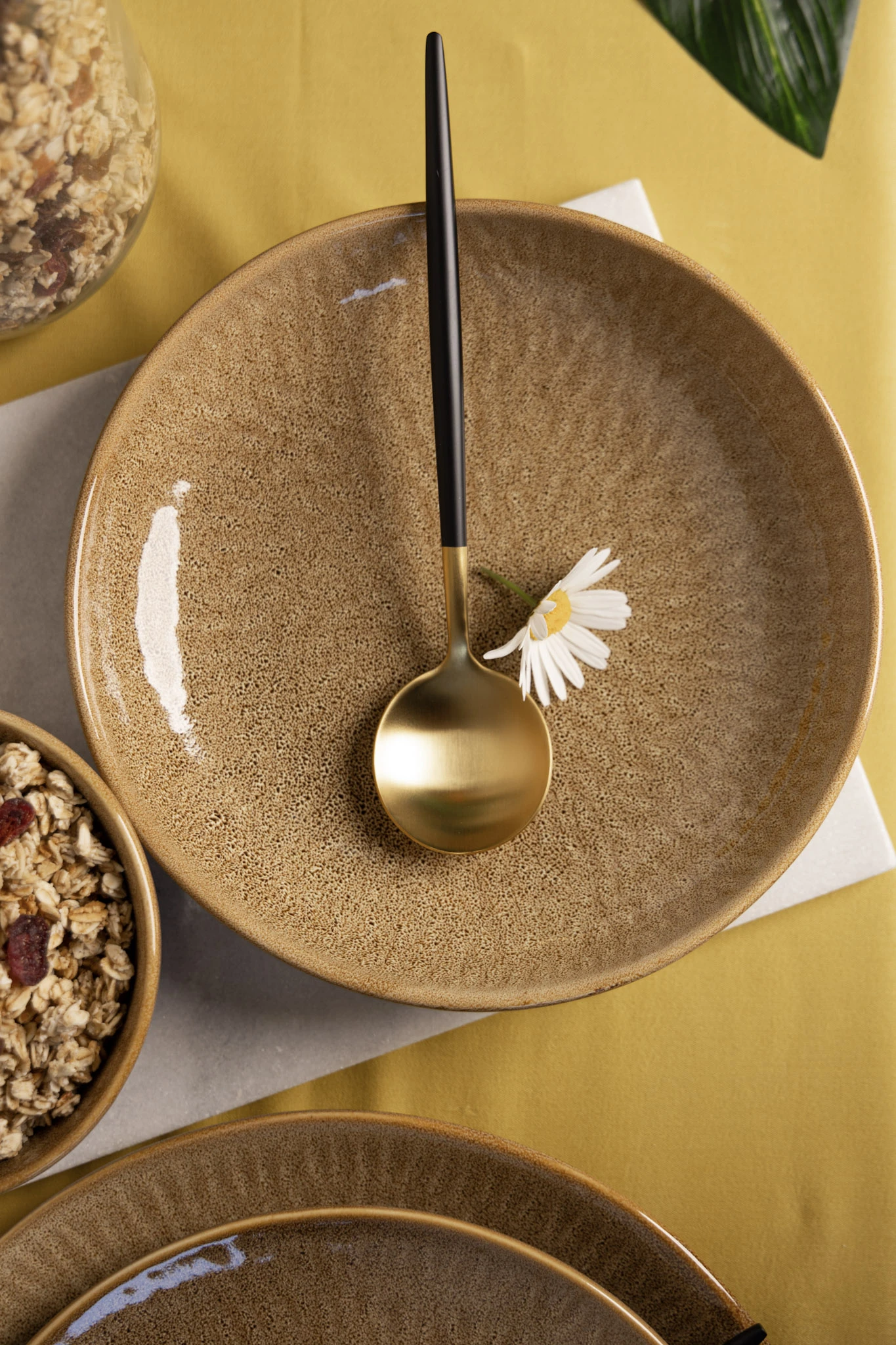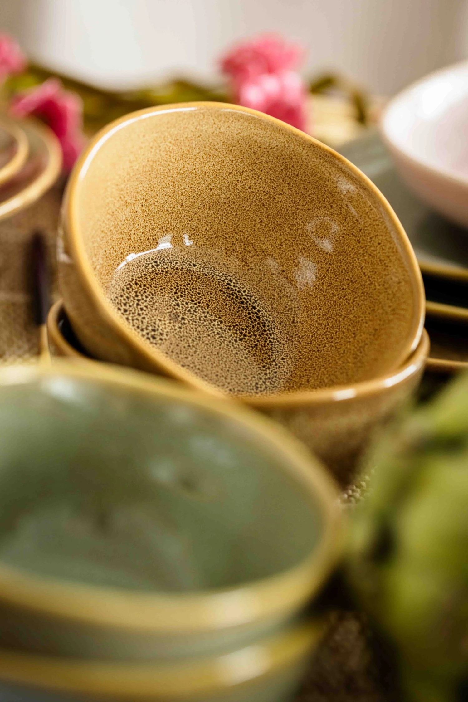 Het servies is afgewerkt met een ‘reactive glaze‘, ofwel reactief glazuur. Dit houdt in dat tijdens het bakproces van het servies een chemische reactie plaatsvind. Deze reactie zorgt ervoor dat elk item van het servies een eigen uniek kleurpatroon krijgt. Hierdoor ontstaan allemaal unieke borden, kommen en bekers. Groot is het verschil niet, het geheel past perfect bij elkaar!