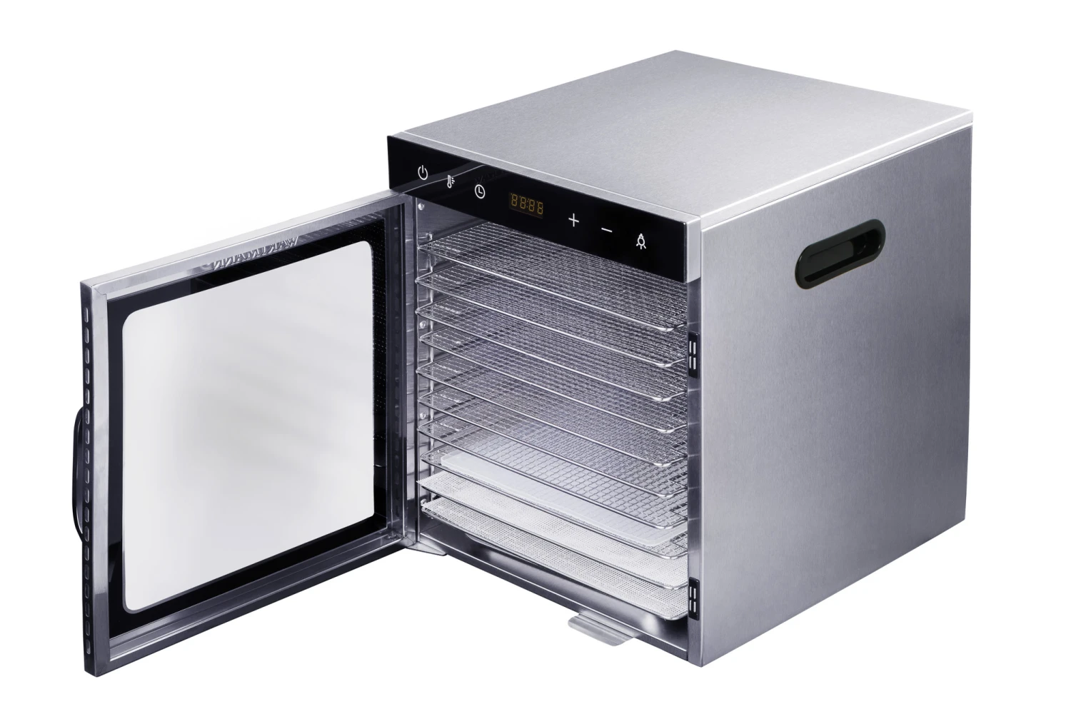 De voedseldroger droogt horizontaal over de laden en droogt gelijkmatig. Door het overzichtelijke bedieningspaneel kan je eenvoudig de gewenste tijd en temperatuur instellen. De temperatuur is instelbaar van 35 tot 80 graden Celsius en de tijdklok is instelbaar van 30 minuten tot 72 uur. De Wartmann Voedseldroger – 10 Laags wordt geleverd met 10 droogroosters en een druipplaat.
